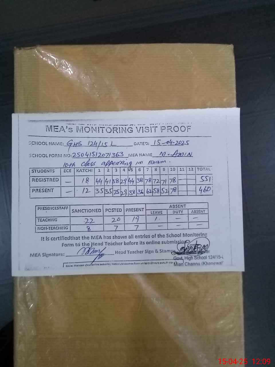 | Attendance Register | Head Teacher | MEA with School | Visit Proof |