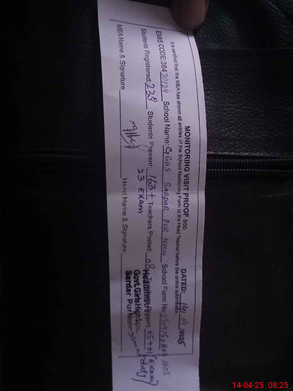 | Remarks (Use Separate Page if Required): Class 10th 23 students spared for annual examination | |||||