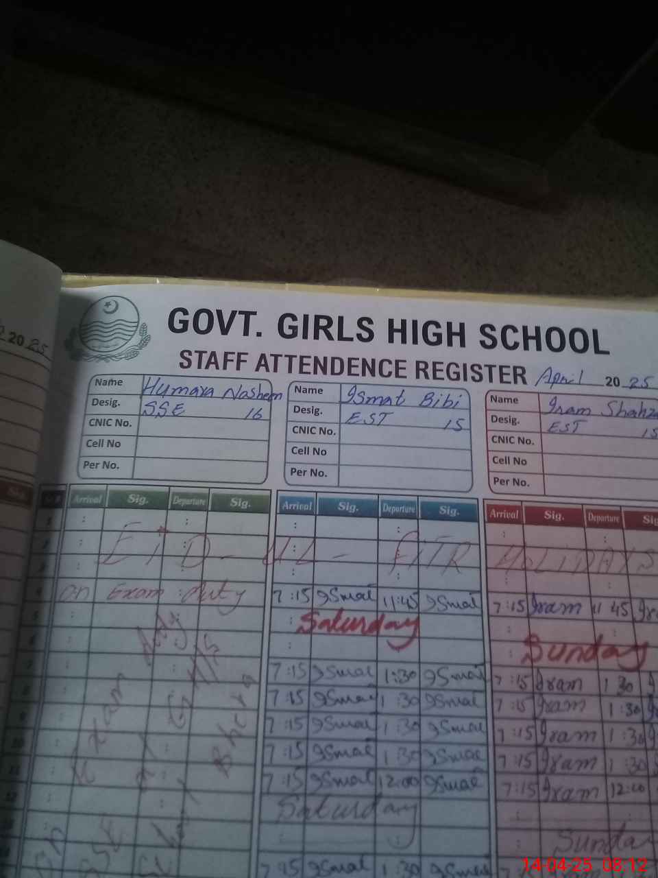 | CNIC | Full Name | Designation | R/C | Absence During Last Calender Month |