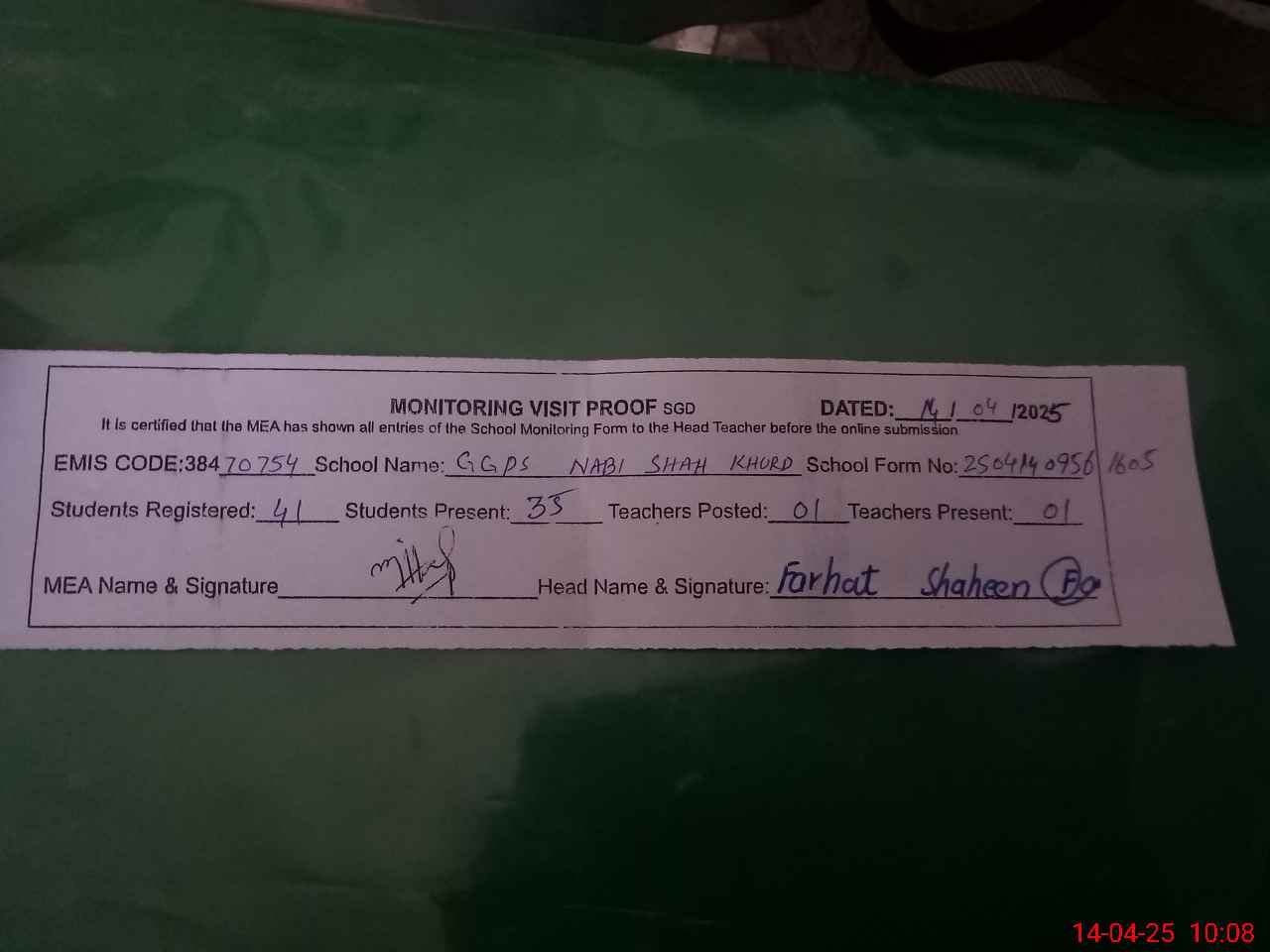 | Attendance Register | Head Teacher | MEA with School | Visit Proof |