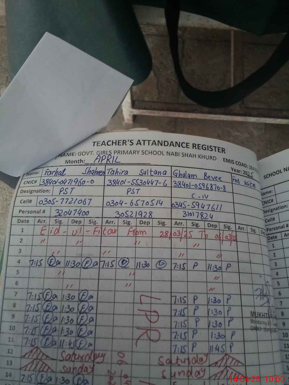 | Name: FA**** SH**** Designation: (School Headmaster's/Headmistress's) PST(SC-MATH) Phone/Cell Number: 03**** |