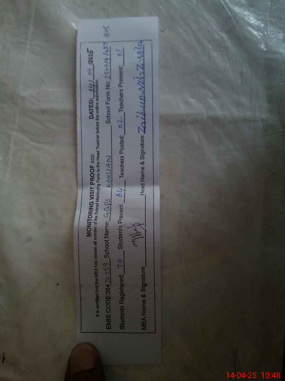 | Attendance Register | Head Teacher | MEA with School | Visit Proof |