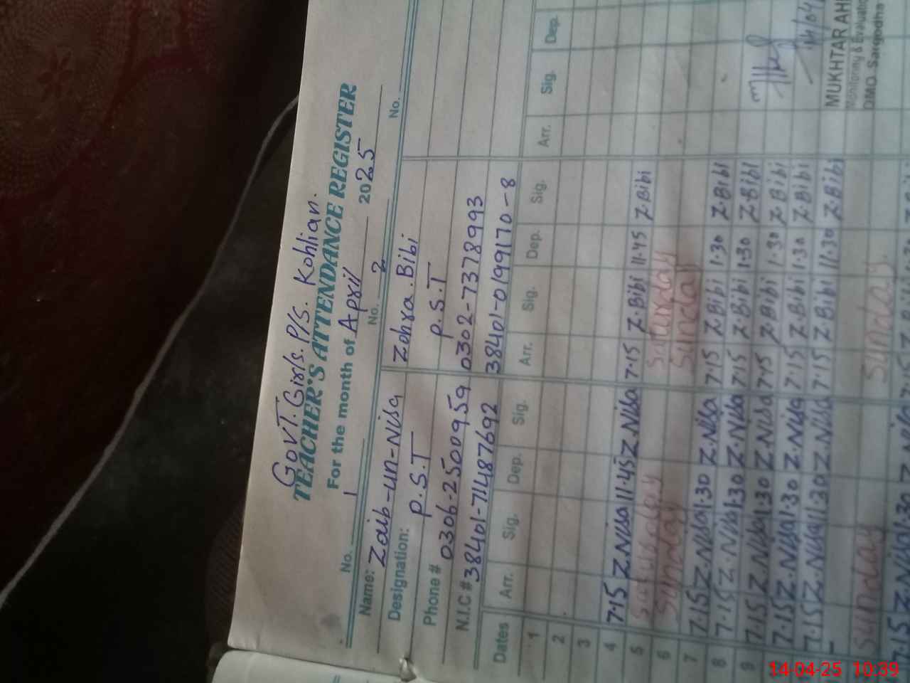 | Name: ZA**** UNNI**** Designation: (School Headmaster's/Headmistress's) PST Phone/Cell Number: 03**** |