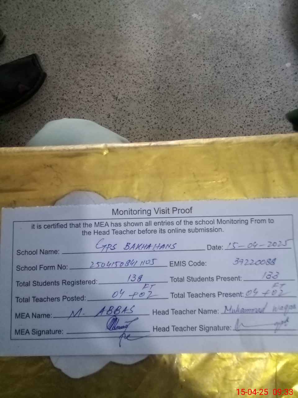| Attendance Register | Head Teacher | MEA with School | Visit Proof |