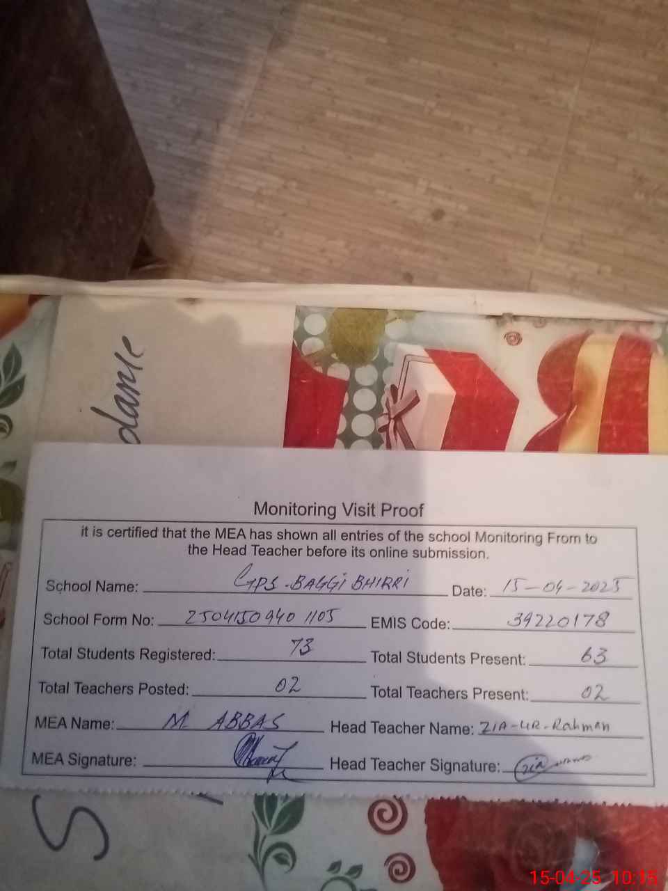 | Attendance Register | Head Teacher | MEA with School | Visit Proof |