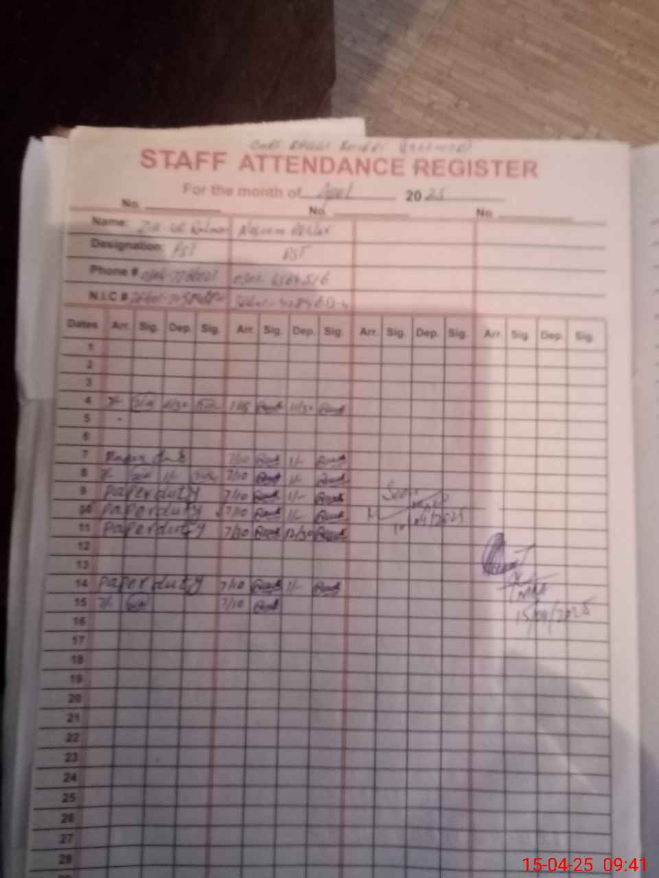| CNIC | Full Name | Designation | R/C | Absence during last cal. month |
