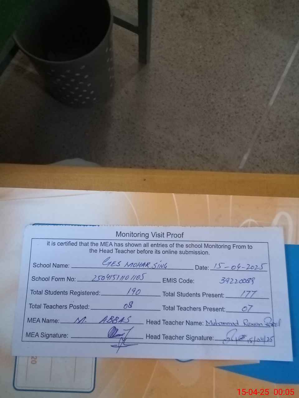 | EMIS Code: 39220089 | Name of School: GES MOHER SINGH ARIFWALA | |||