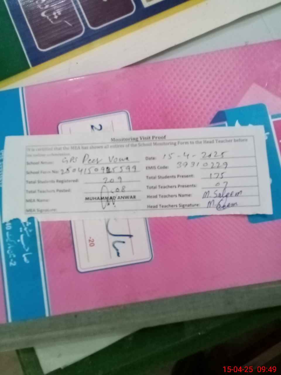 | Attendance Register | Head Teacher | MEA with School | Visit Proof |