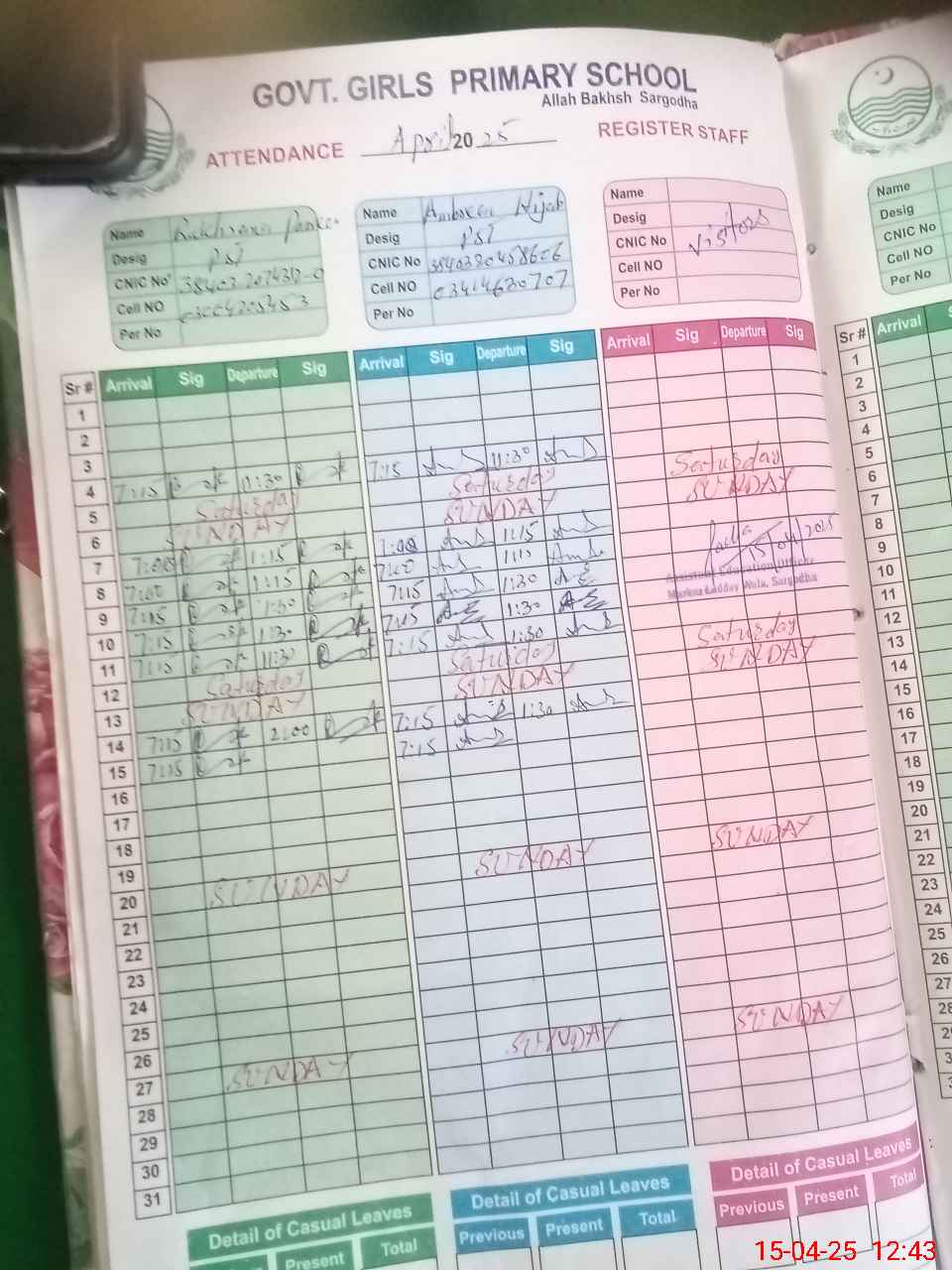 | CNIC | Full Name | Designation | R/C | Absence During Last Calender Month |