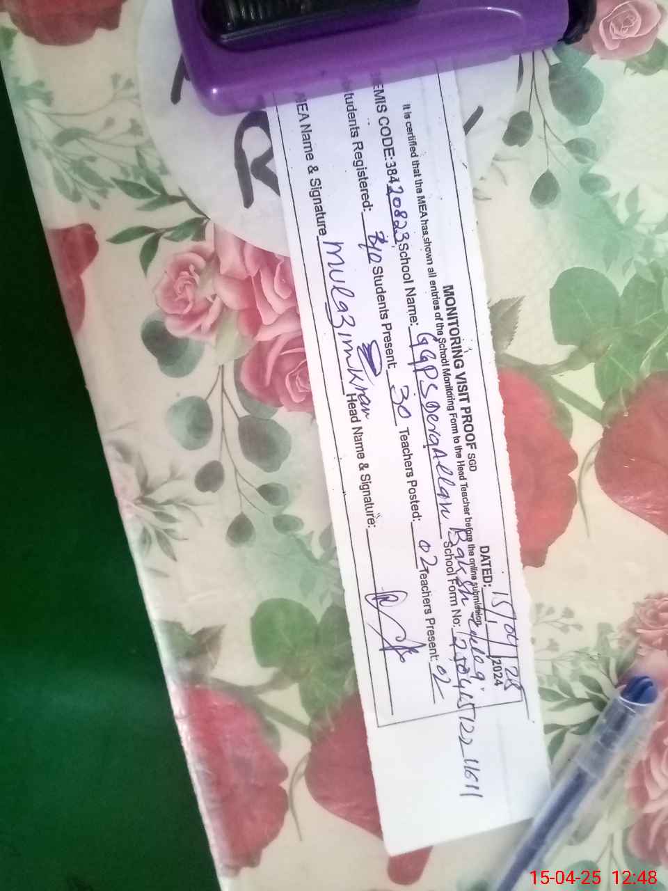 | Attendance Register | Head Teacher | MEA with School | Visit Proof |