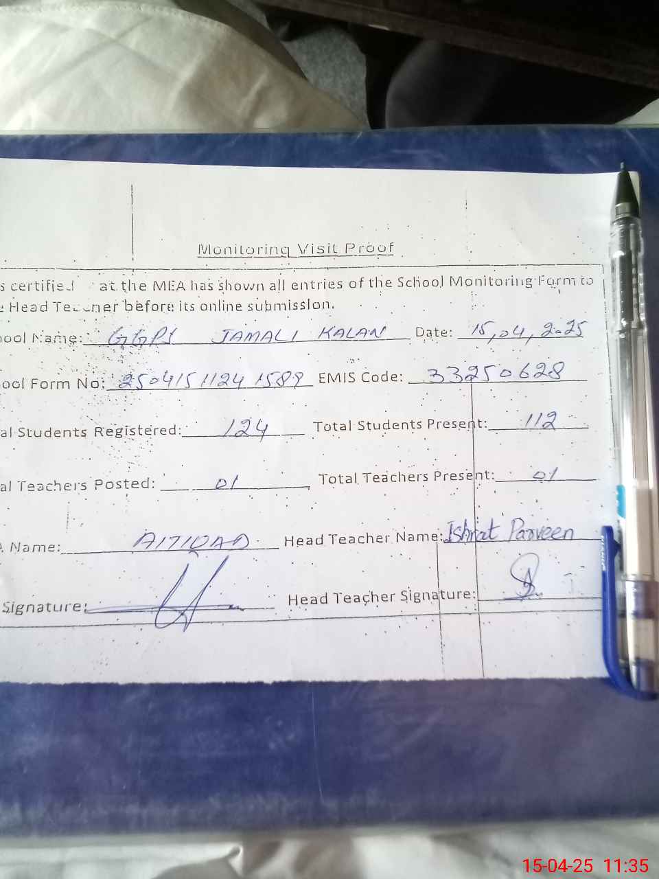 | Attendance Register | Head Teacher | MEA with School | Visit Proof |