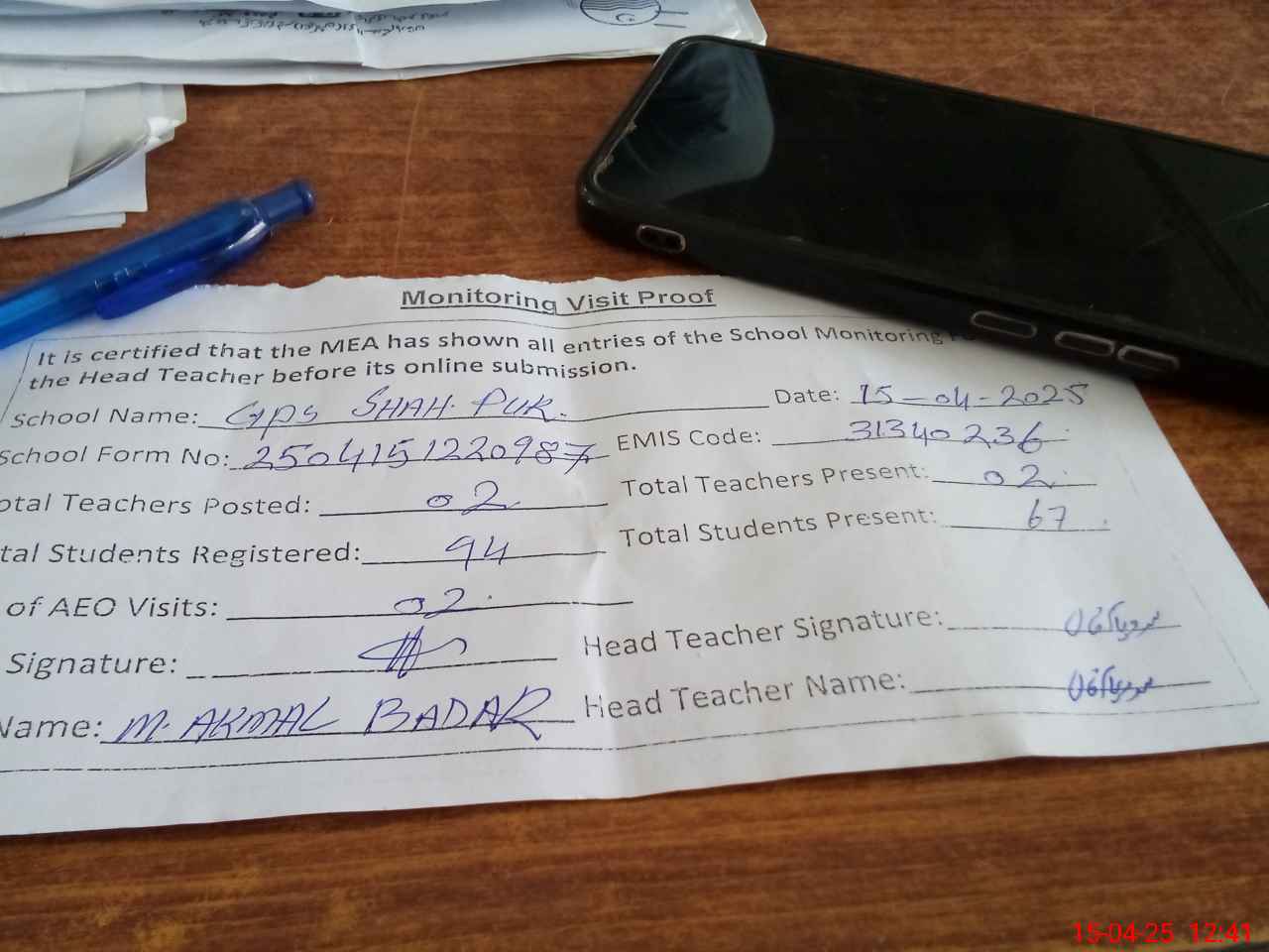 | Attendance Register | Head Teacher | MEA with School | Visit Proof |