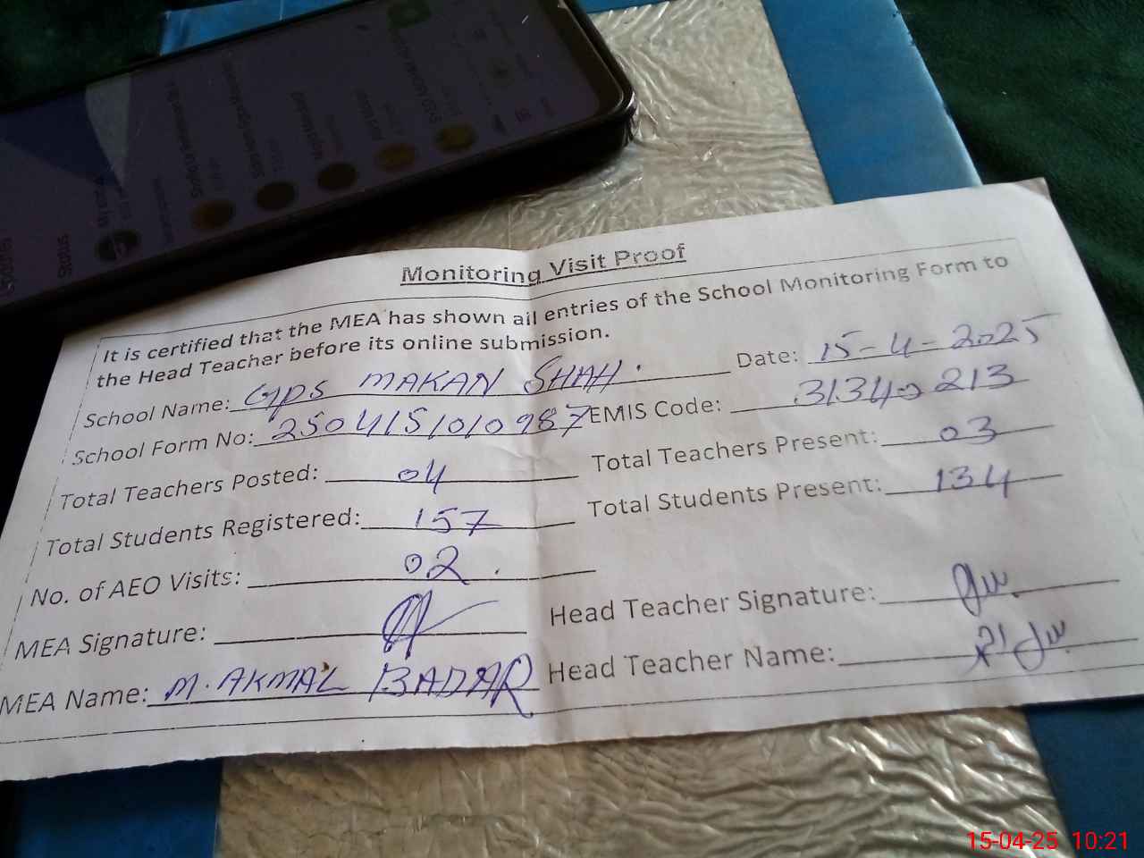 | EMIS Code: 31340213 | Name of School: GPS MAKAN SHAH | |||