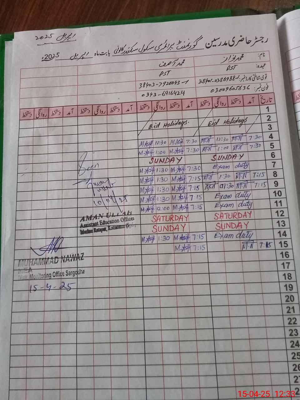 | Name: MU**** NA**** Designation: (School Headmaster's/Headmistress's) PST Phone/Cell Number: 03**** |
