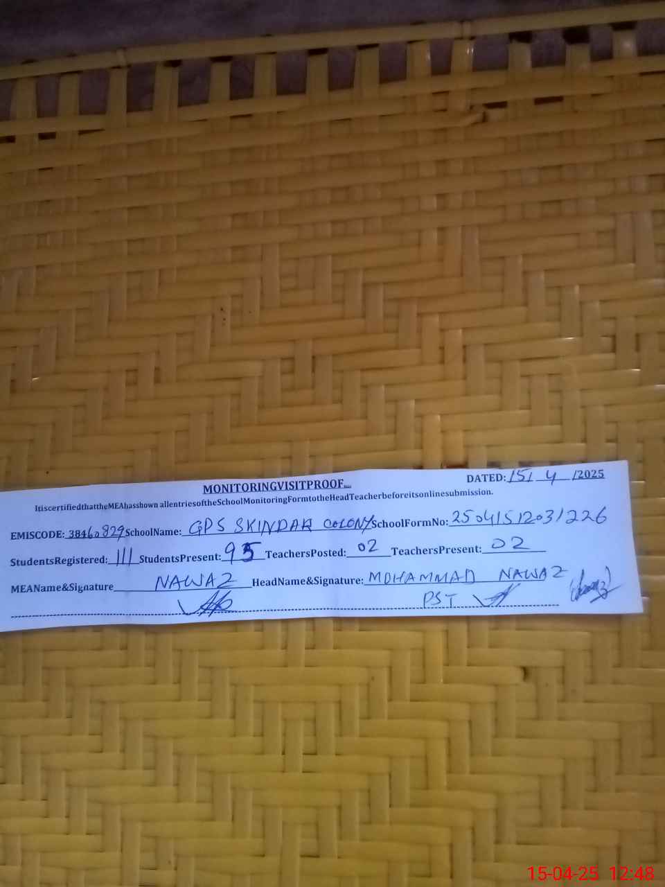 | Certified that this School was Inspected by the Undersigned MEA/DMO Today and the Information Stated Above is as Per Record. | |||||