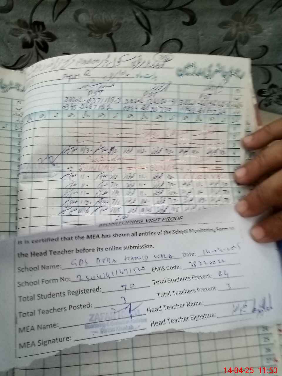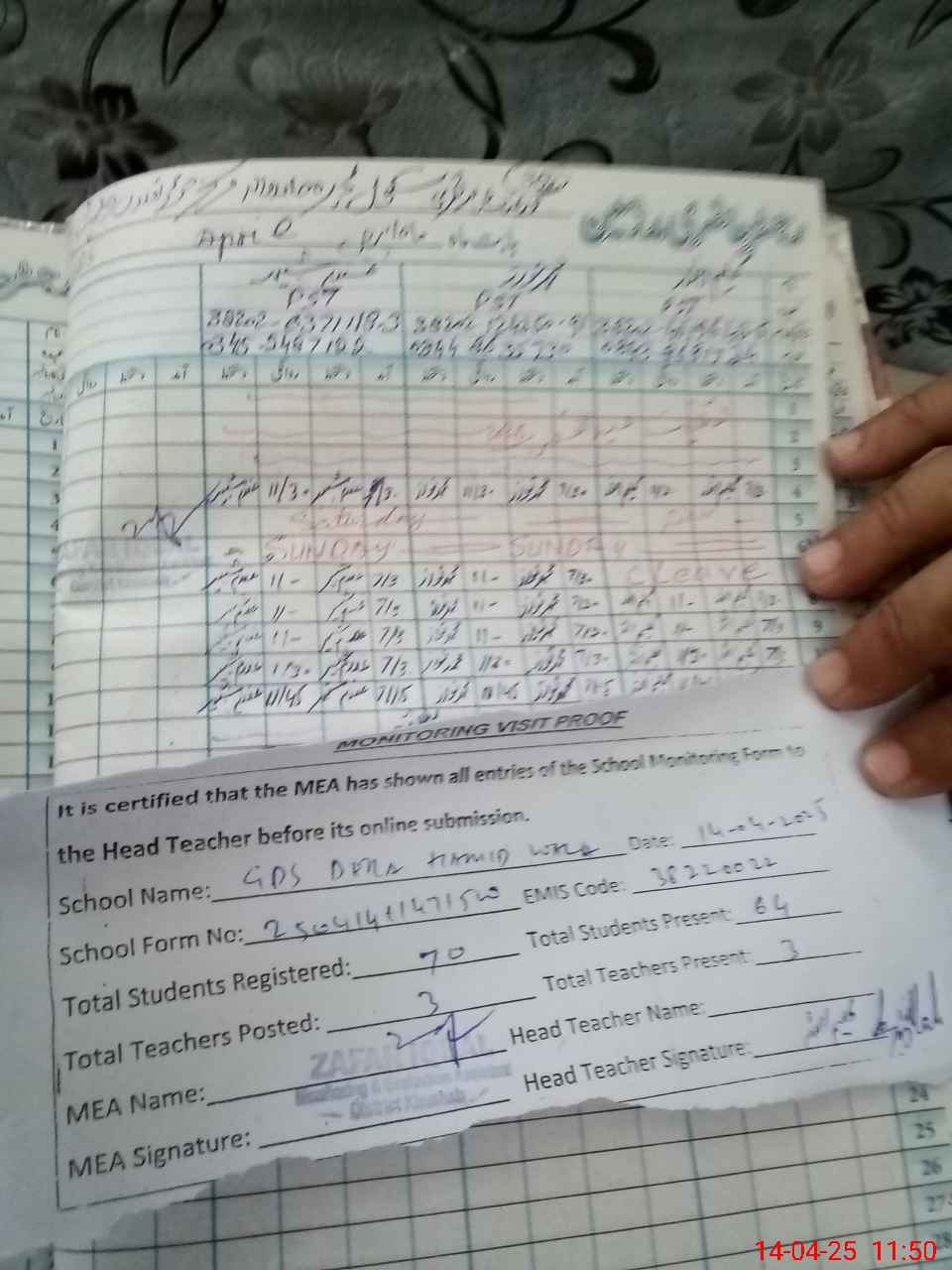 | Attendance Register | Head Teacher | MEA with School | Visit Proof |