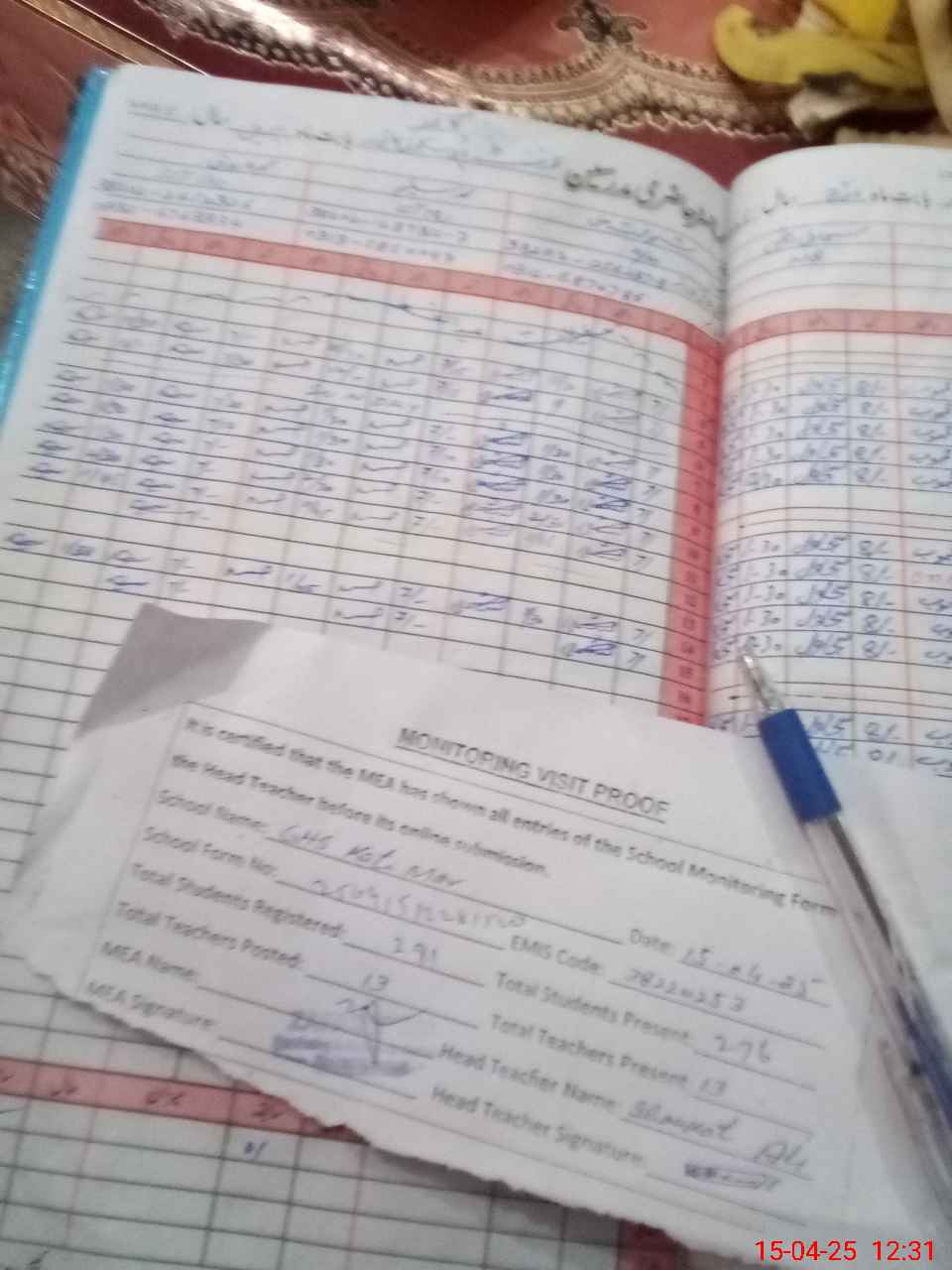 | Attendance Register | Head Teacher | MEA with School | Visit Proof |