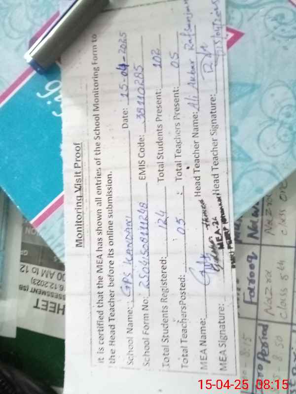 | Attendance Register | Head Teacher | MEA with School | Visit Proof |