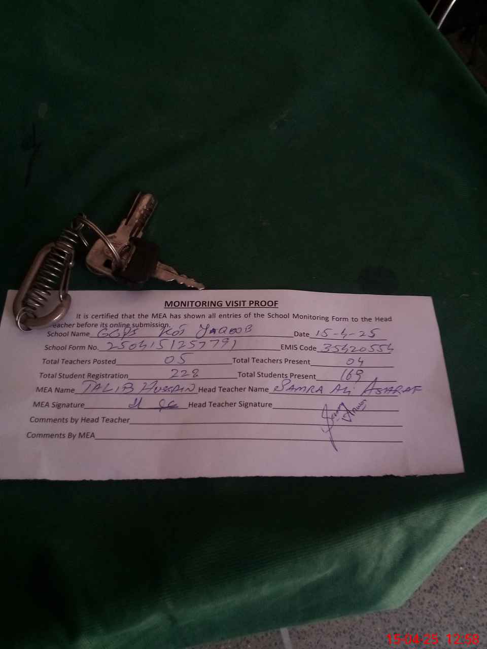 | Attendance Register | Head Teacher | MEA with School | Visit Proof |