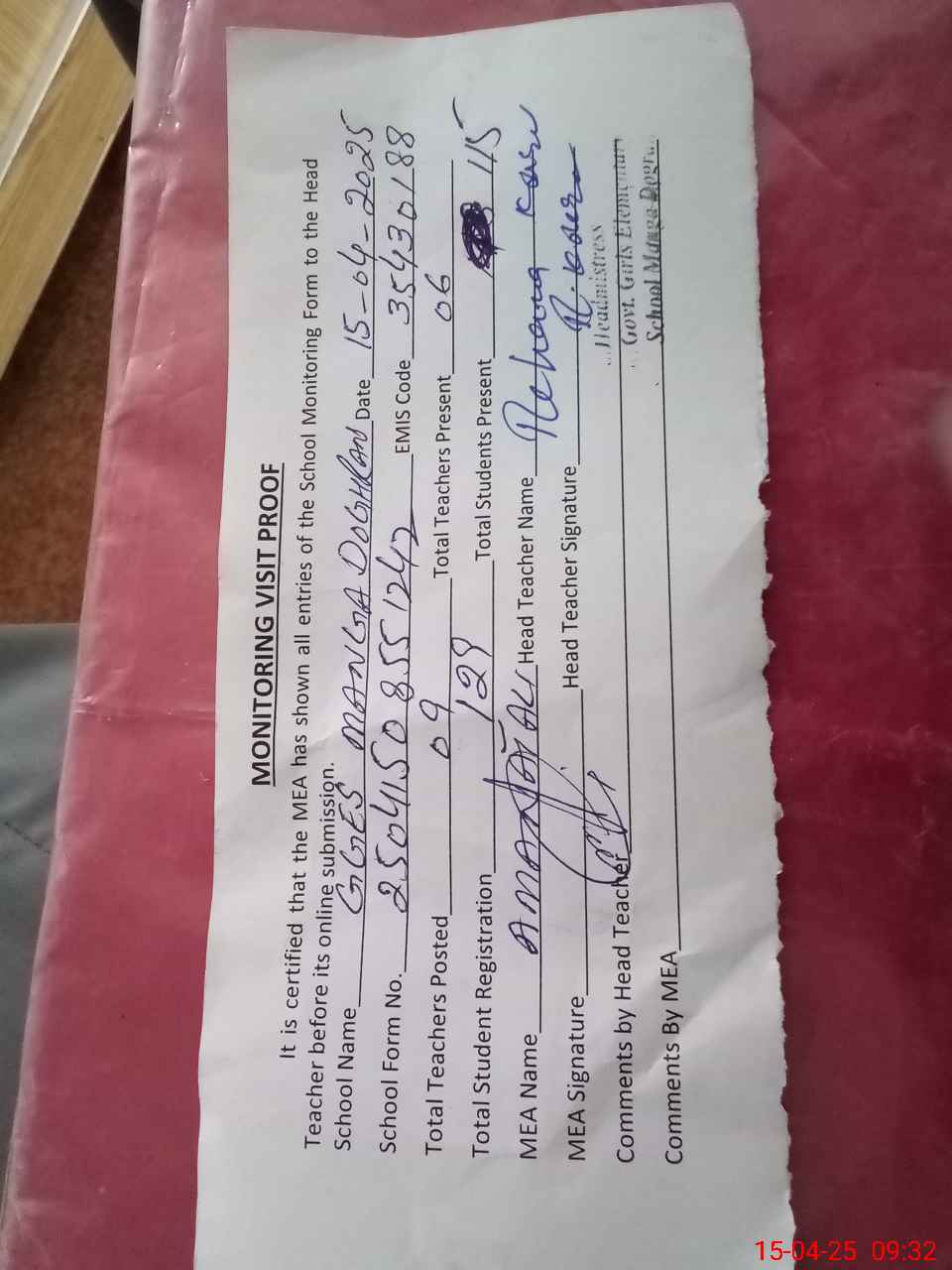 | Attendance Register | Head Teacher | MEA with School | Visit Proof |