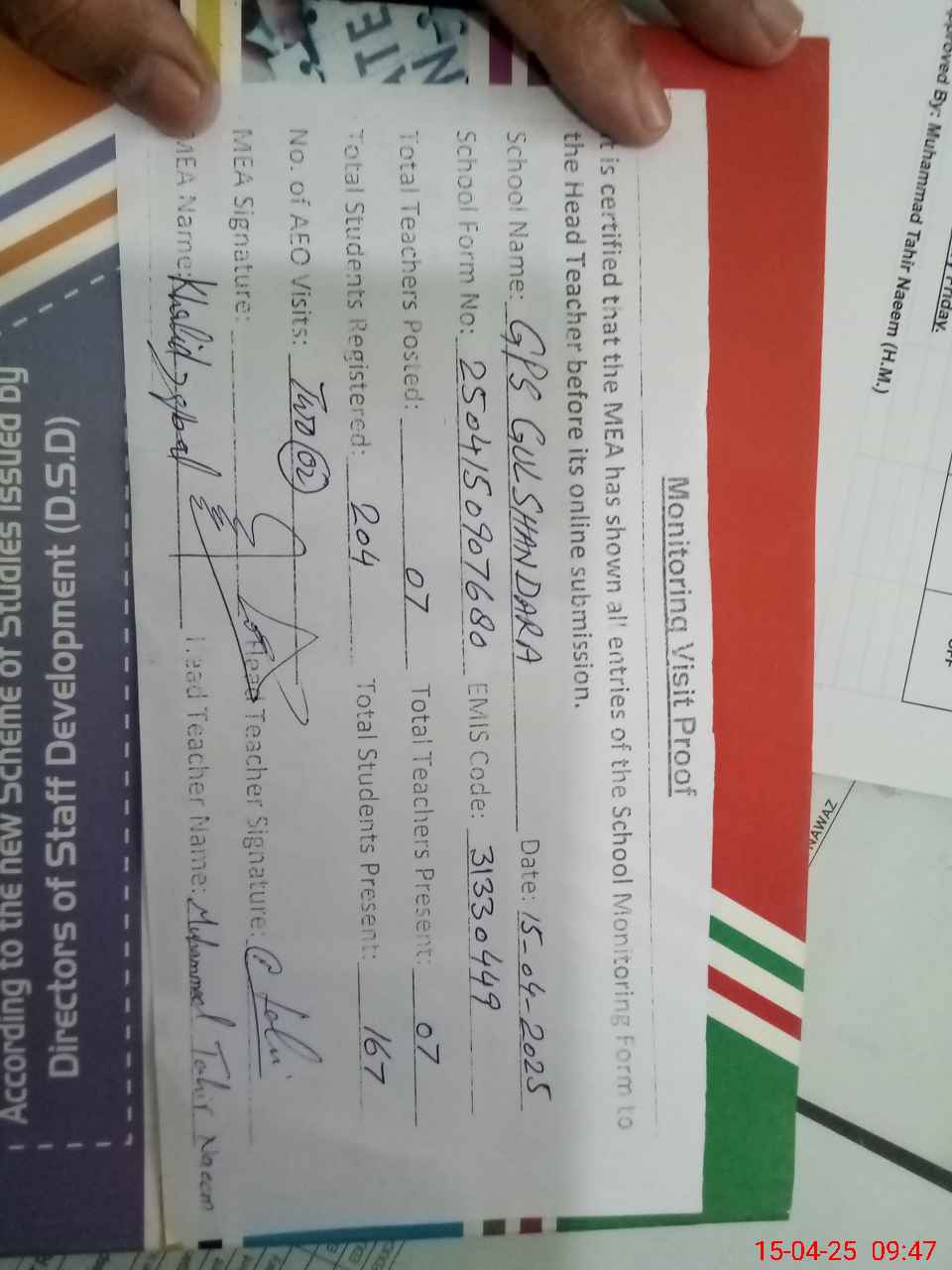 | EMIS Code: 31330449 | Name of School: GPS GULSHANDARA | |||
