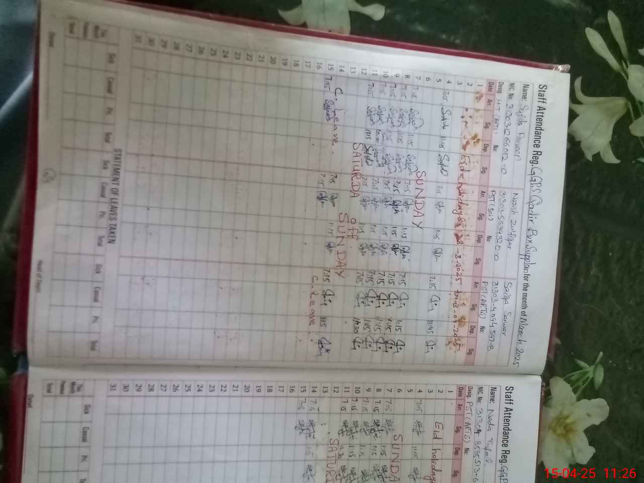 | Leave | Duty | Absent | Maternity | Medical | Ex- Pak |