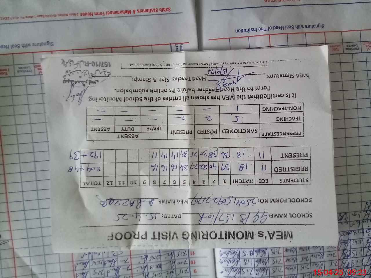 | Attendance Register | Head Teacher | MEA with School | Visit Proof |