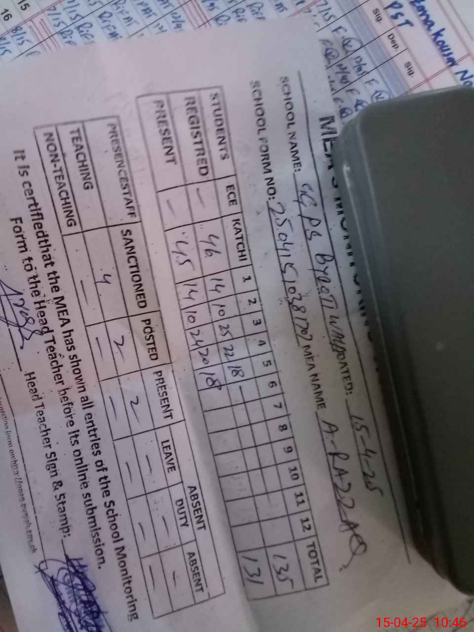 | Attendance Register | Head Teacher | MEA with School | Visit Proof |