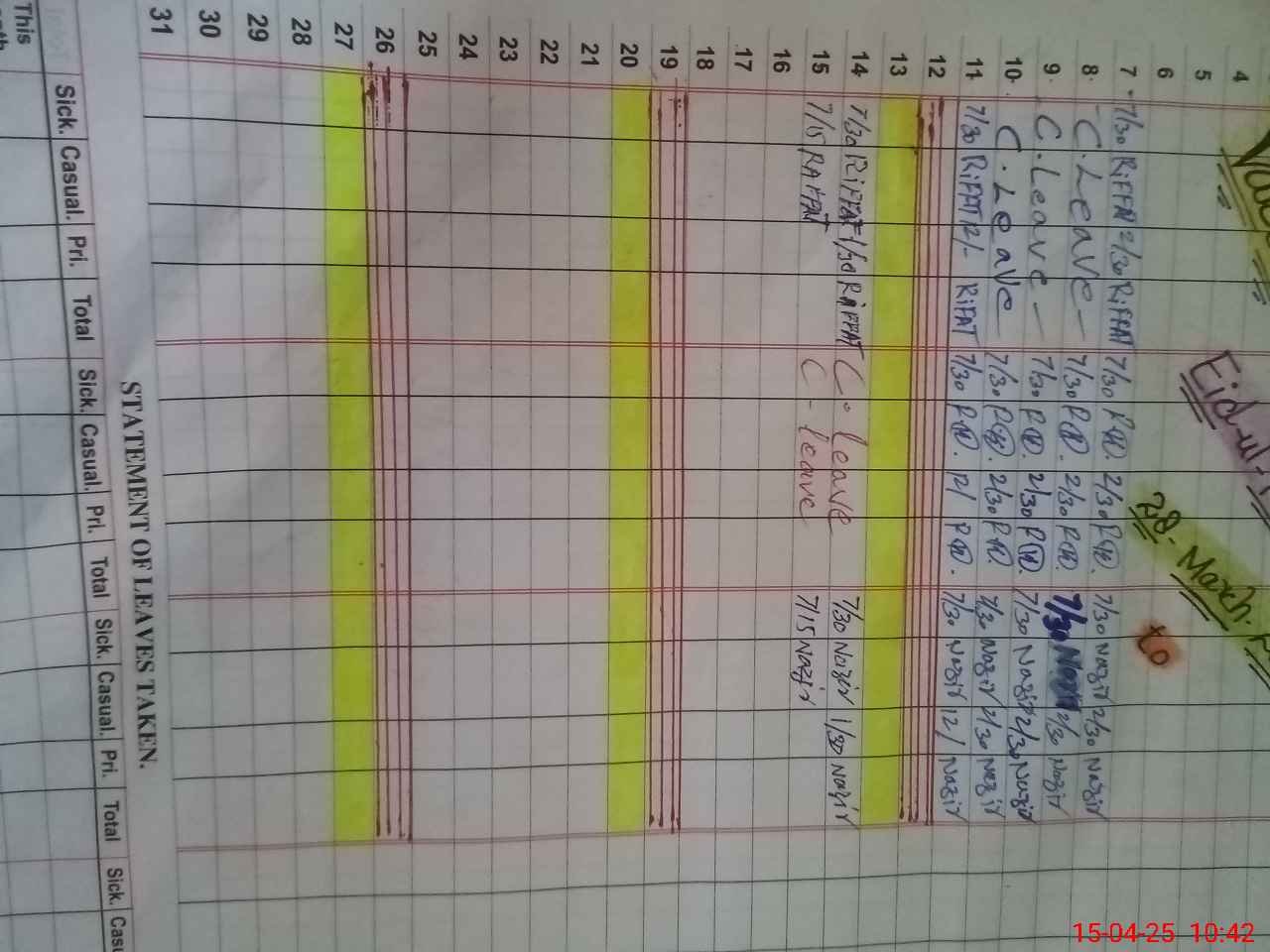 | Leave | Duty | Absent | Maternity | Medical | Ex- Pak |