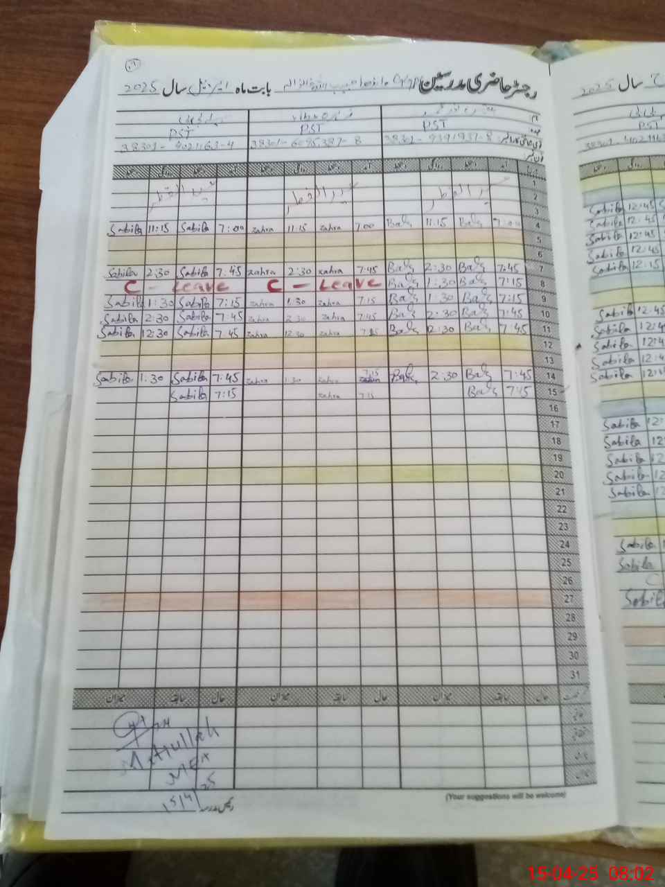 | CNIC | Full Name | Designation | R/C | Absence During Last Calender Month |