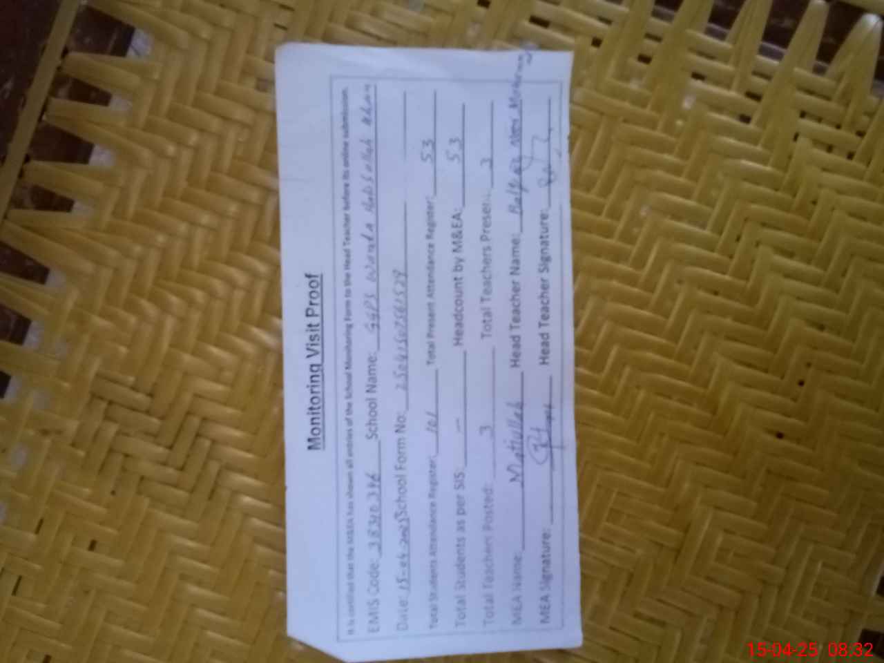 | Attendance Register | Head Teacher | MEA with School | Visit Proof |