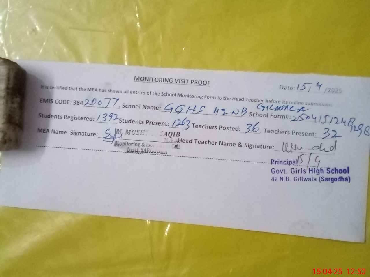 | Attendance Register | Head Teacher | MEA with School | Visit Proof |