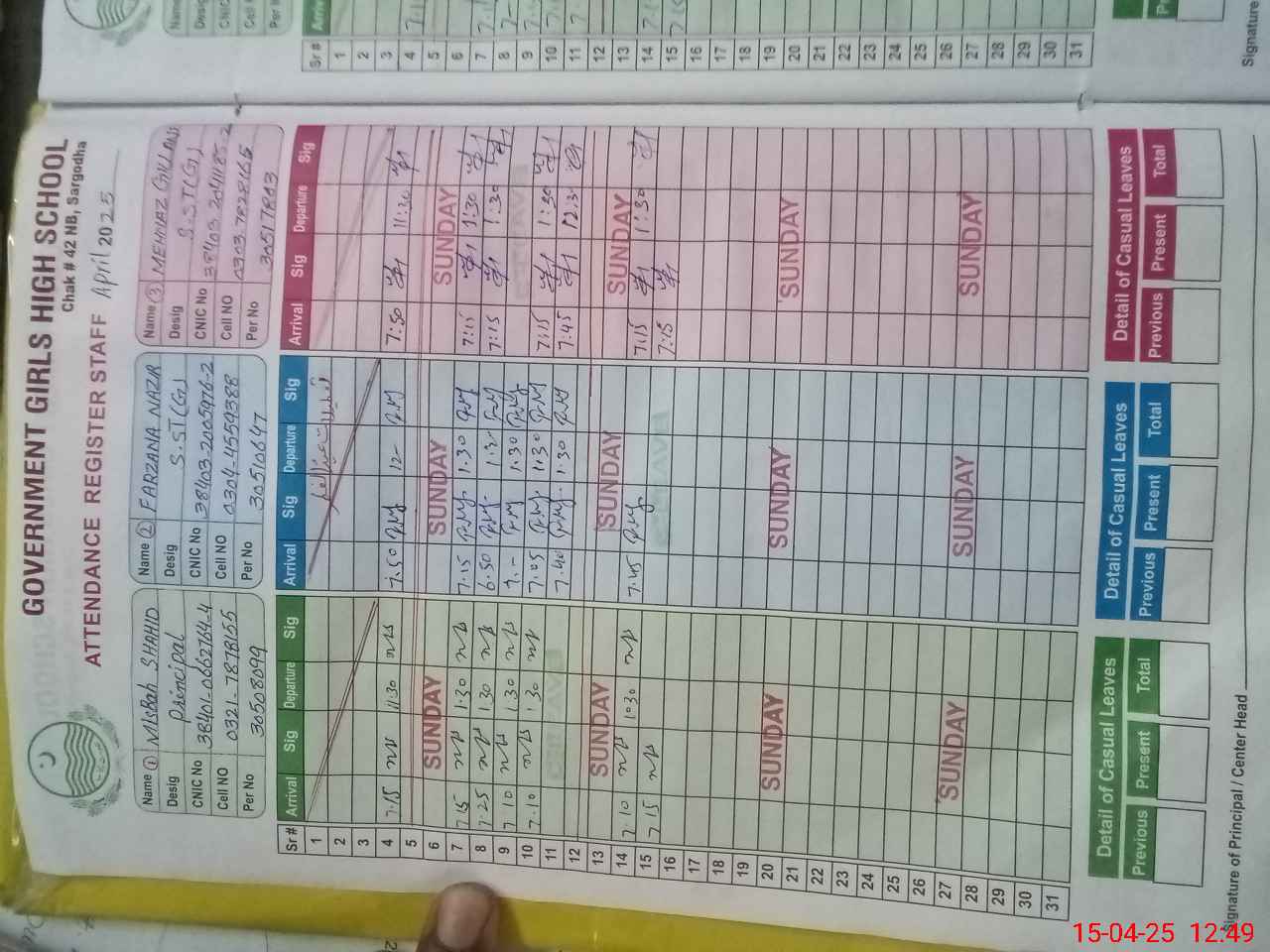| CNIC | Full Name | Designation | R/C | Absence During Last Calender Month |