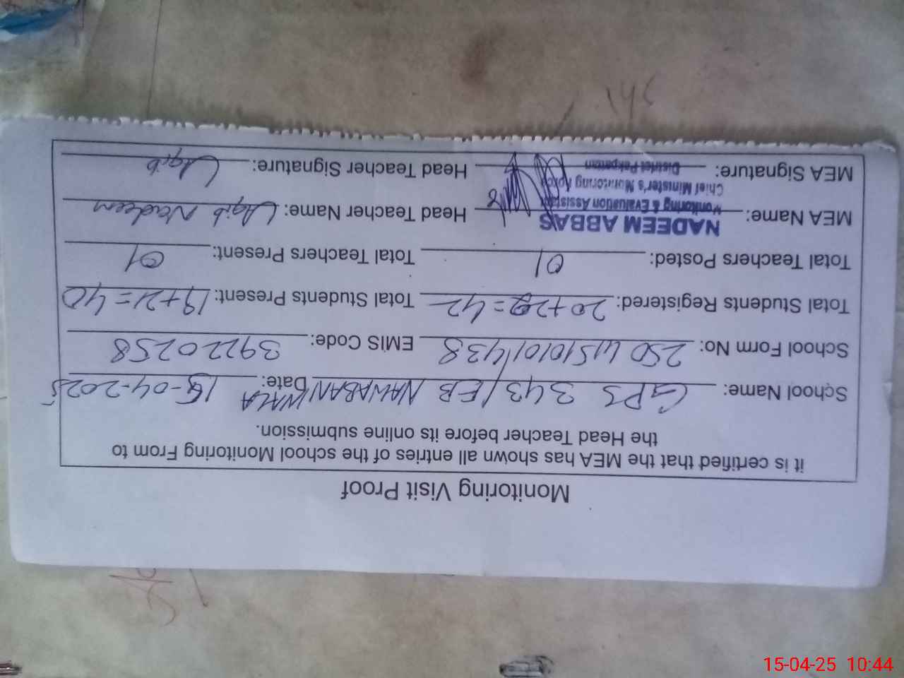 | Attendance Register | Head Teacher | MEA with School | Visit Proof |