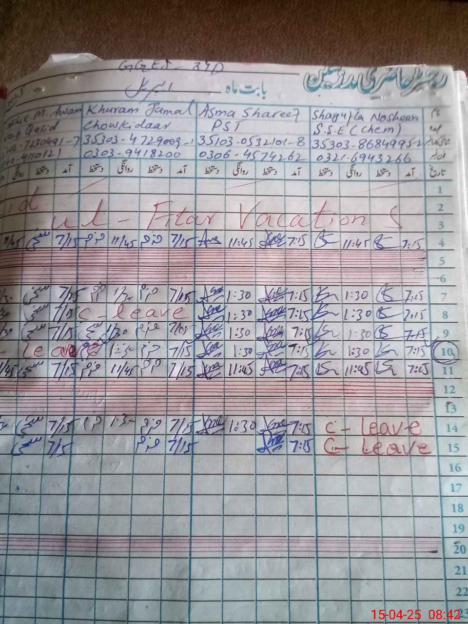 | CNIC | Full Name | Designation | R/C | Absence During Last Calender Month |