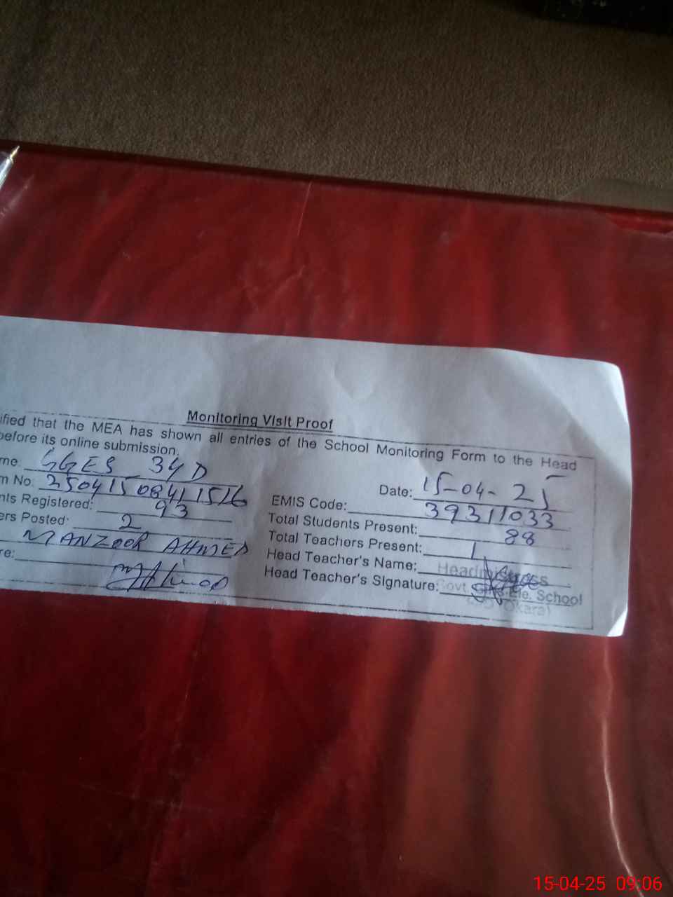 | Attendance Register | Head Teacher | MEA with School | Visit Proof |