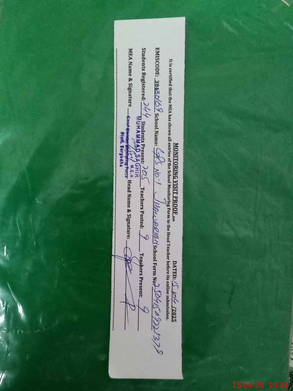 | Certified that this School was Inspected by the Undersigned MEA/DMO Today and the Information Stated Above is as Per Record. | |||||