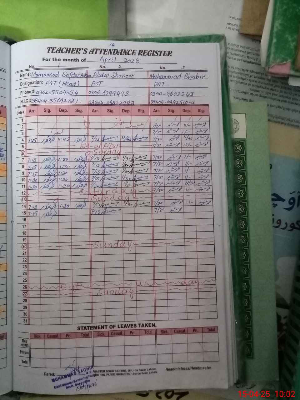 | CNIC | Full Name | Designation | R/C | Absence During Last Calender Month |