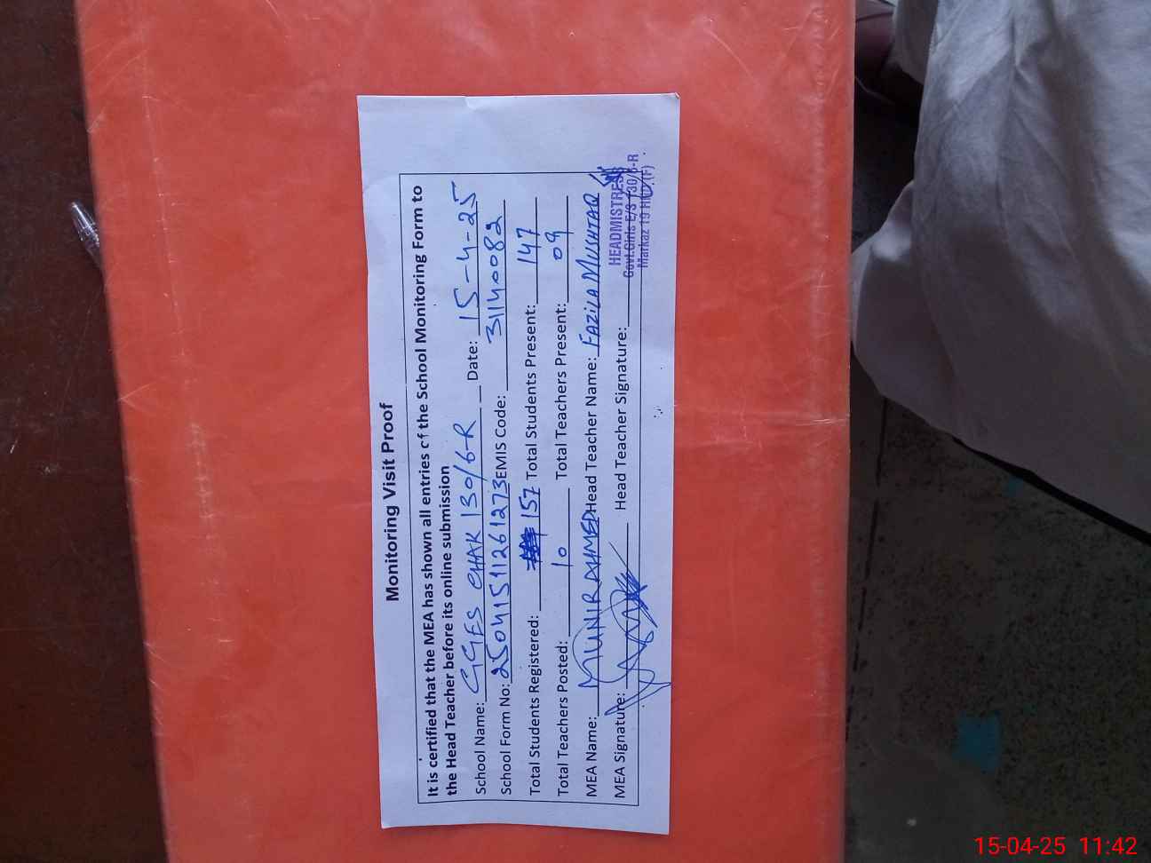 | Attendance Register | Head Teacher | MEA with School | Visit Proof |