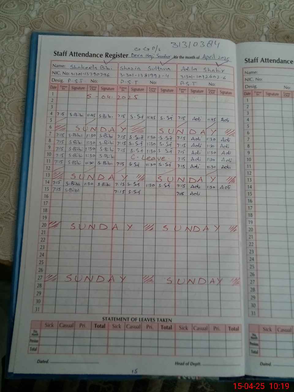 | CNIC | Full Name | Designation | R/C | Absence During Last Calender Month |