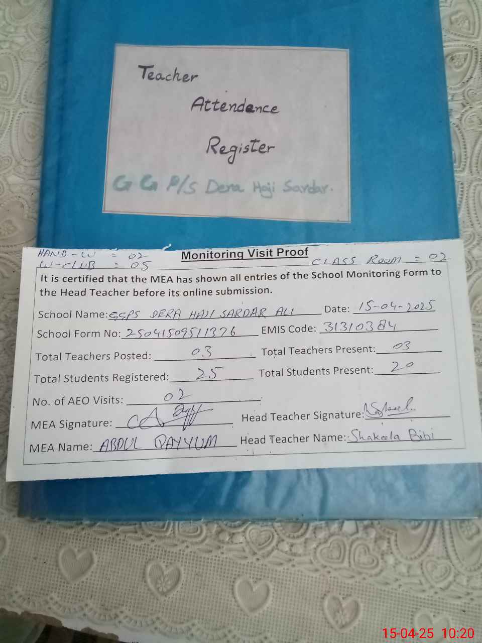 | Attendance Register | Head Teacher | MEA with School | Visit Proof |