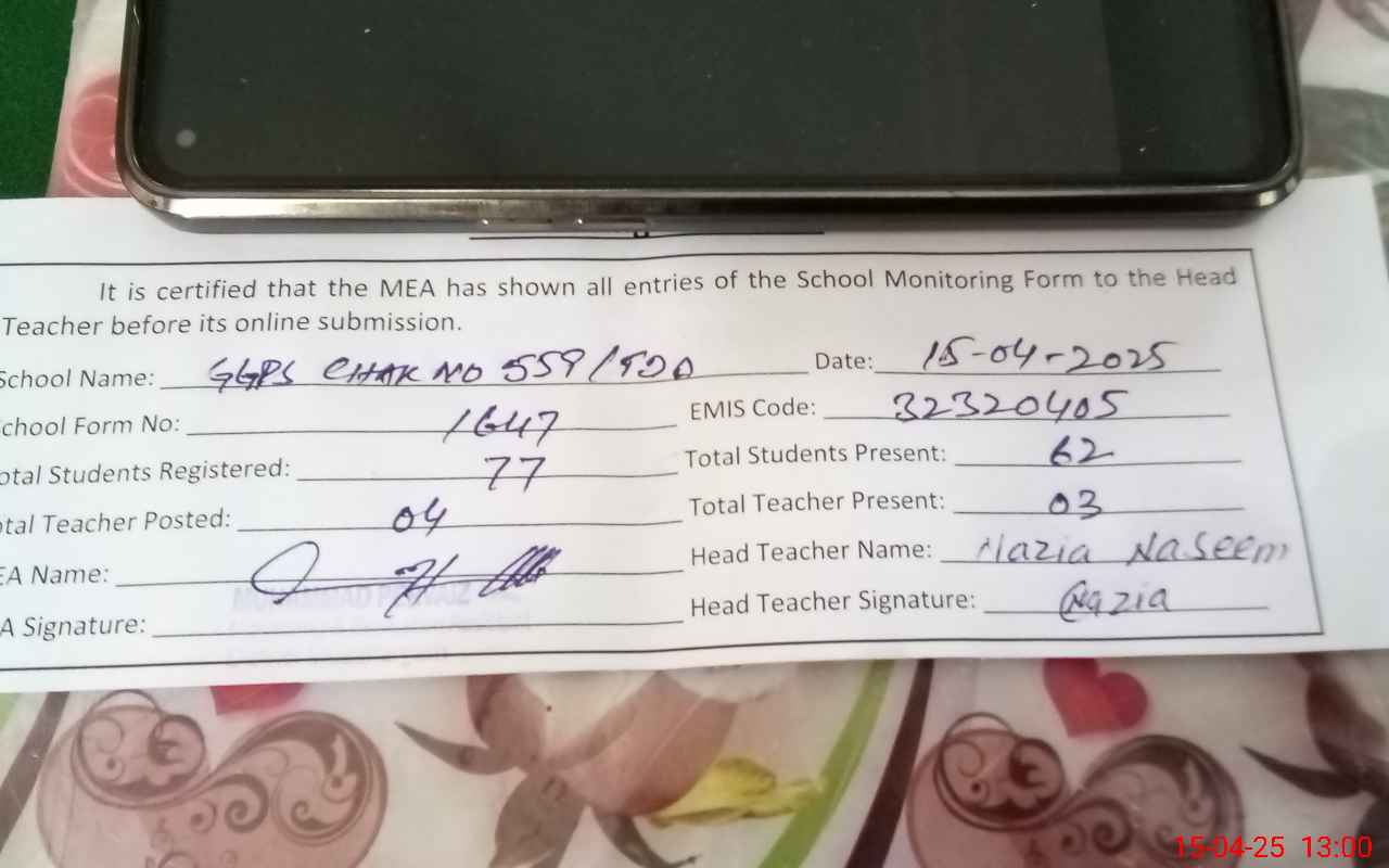 | EMIS Code: 32320405 | Name of School: GGPS CHAK NO. 559 TDA | |||