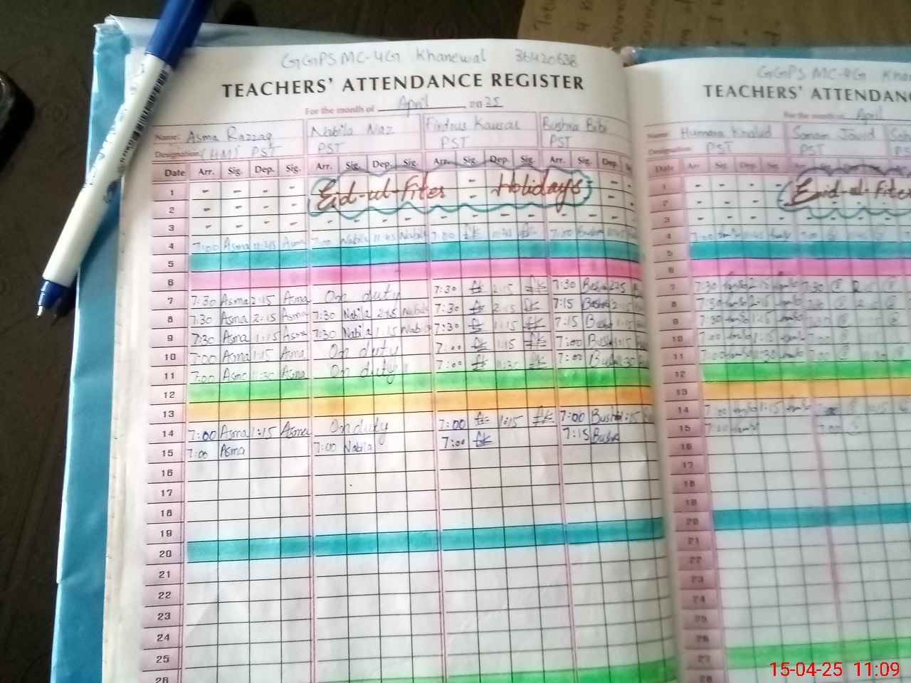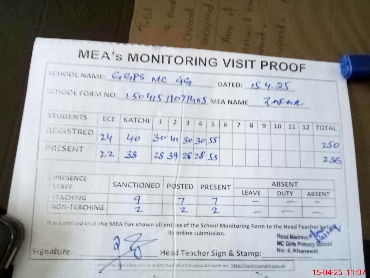 | Attendance Register | Head Teacher | MEA with School | Visit Proof |