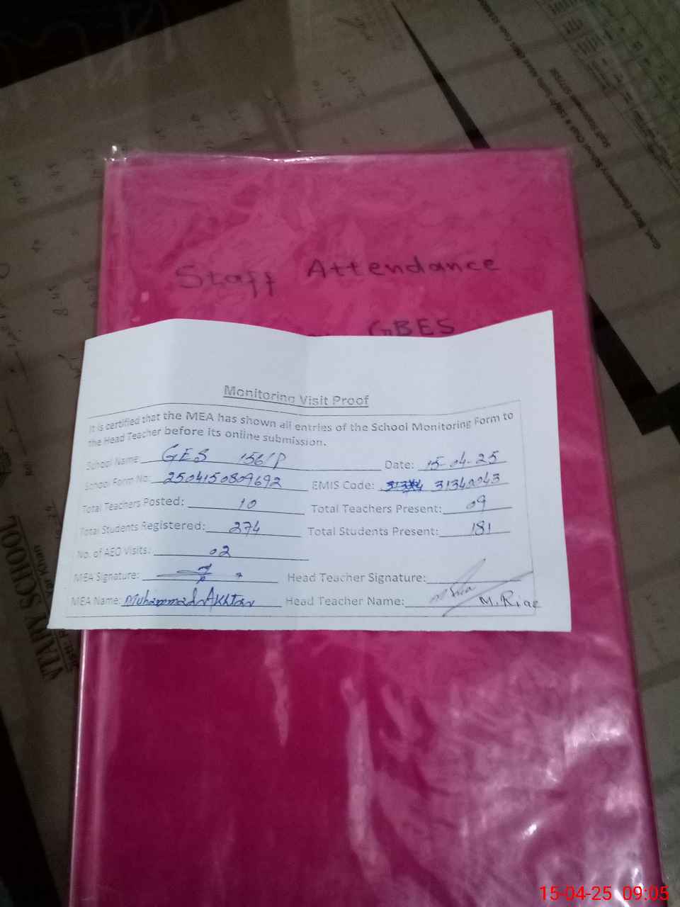 | Attendance Register | Head Teacher | MEA with School | Visit Proof |