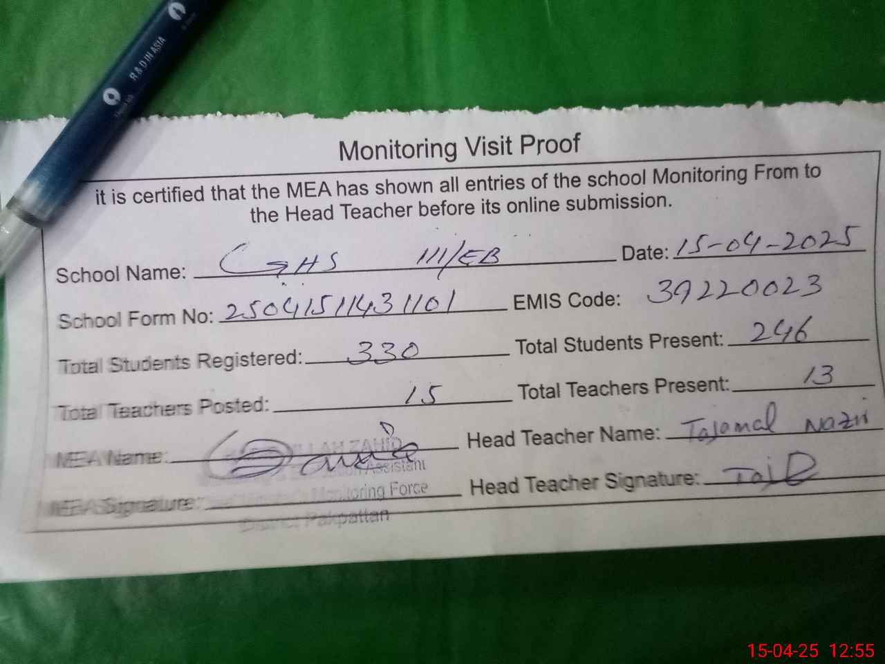 | EMIS Code: 39220023 | Name of School: GHS 111 EB | |||