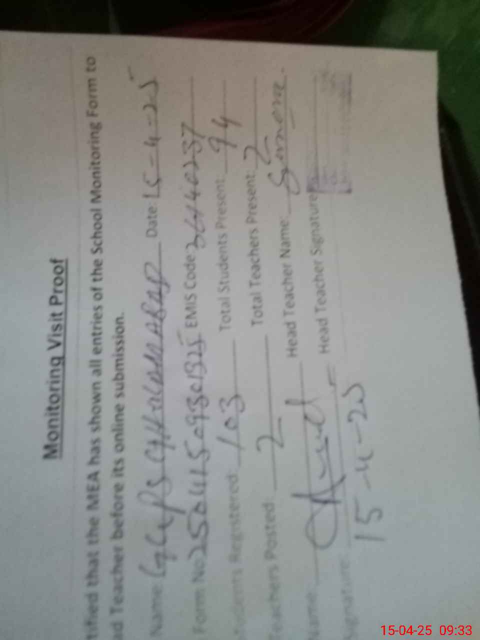 | Attendance Register | Head Teacher | MEA with School | Visit Proof |