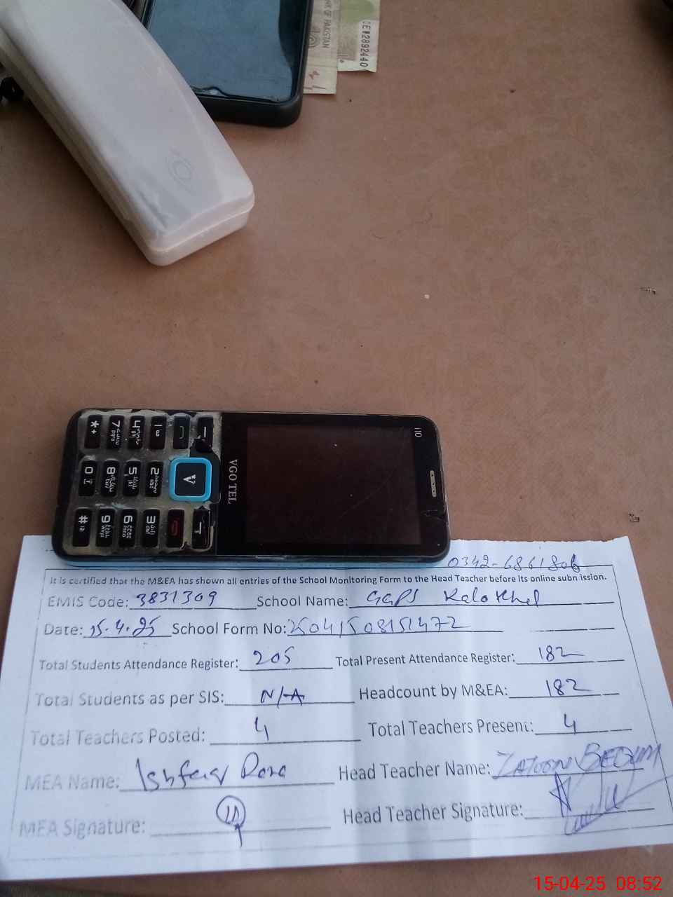 | Attendance Register | Head Teacher | MEA with School | Visit Proof |