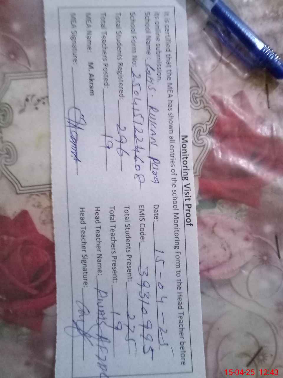 | Attendance Register | Head Teacher | MEA with School | Visit Proof |