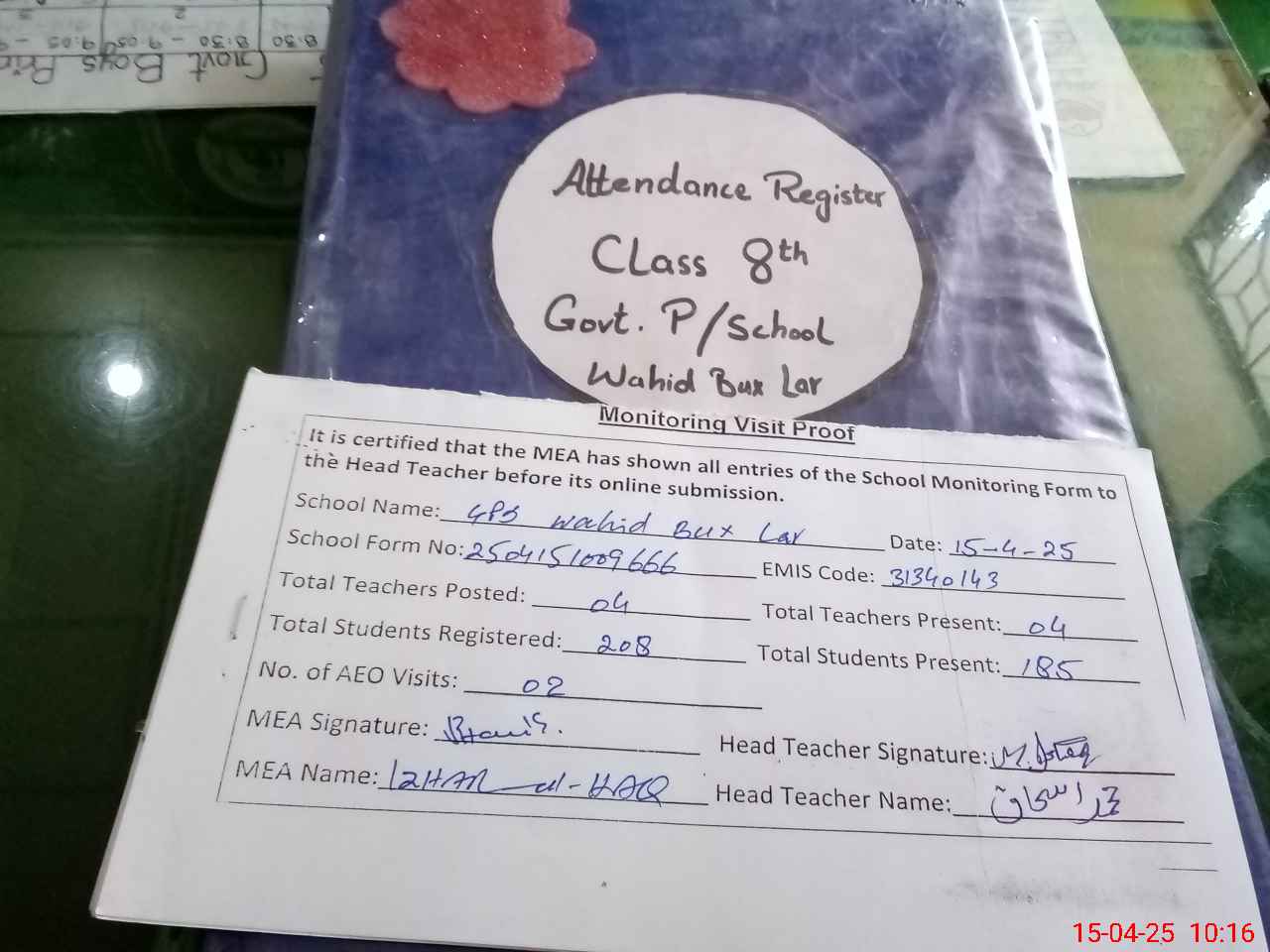 | Attendance Register | Head Teacher | MEA with School | Visit Proof |