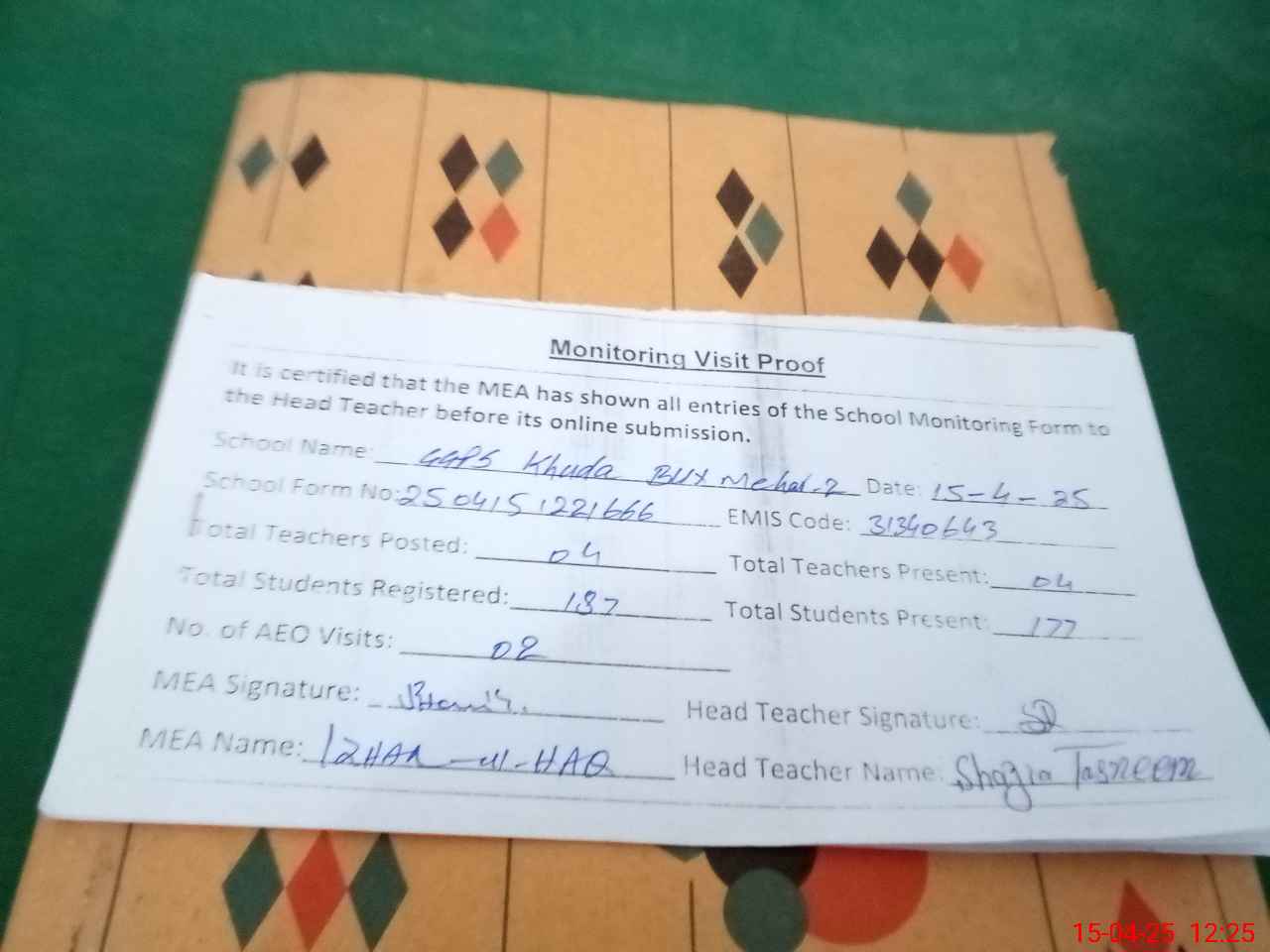 | Attendance Register | Head Teacher | MEA with School | Visit Proof |